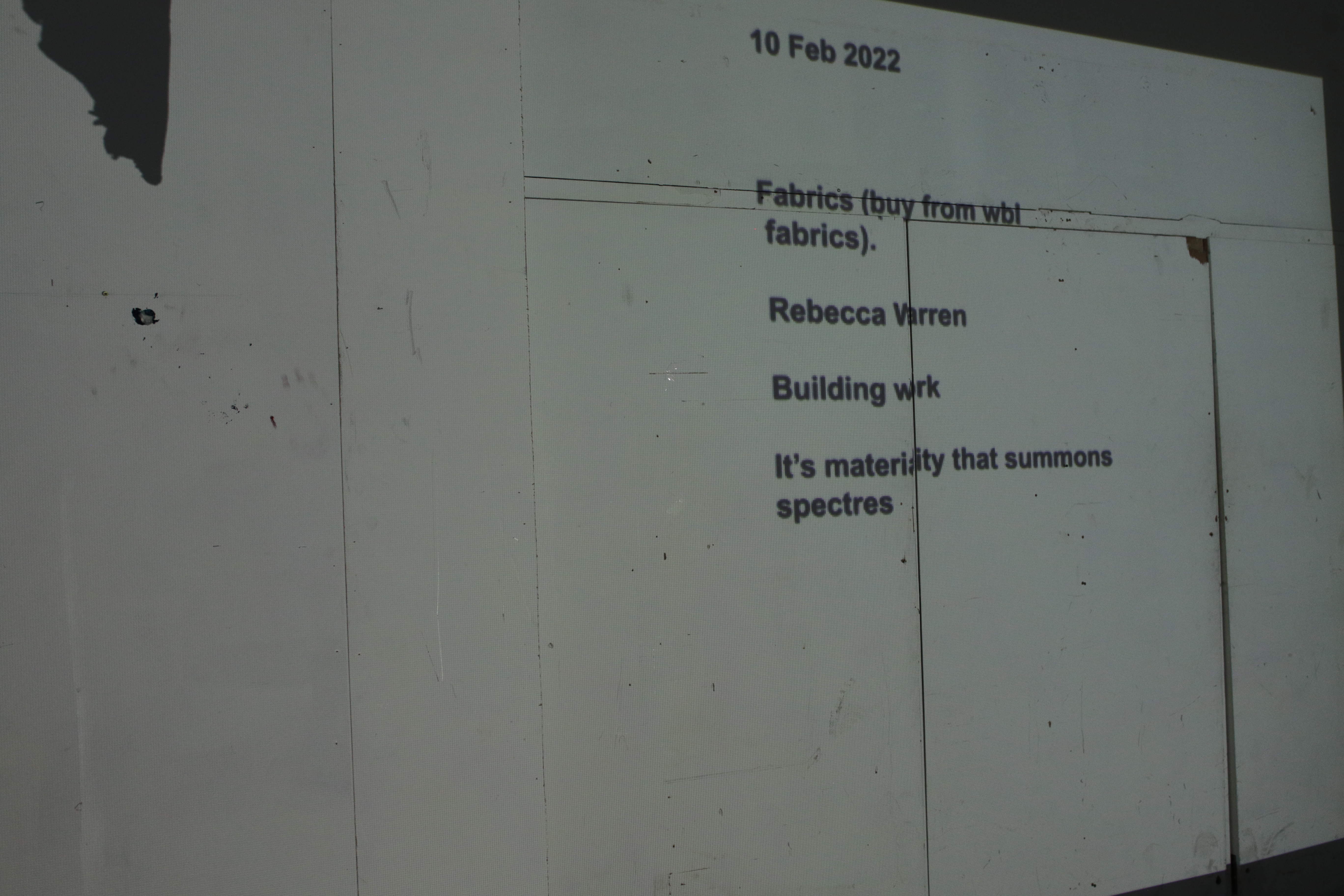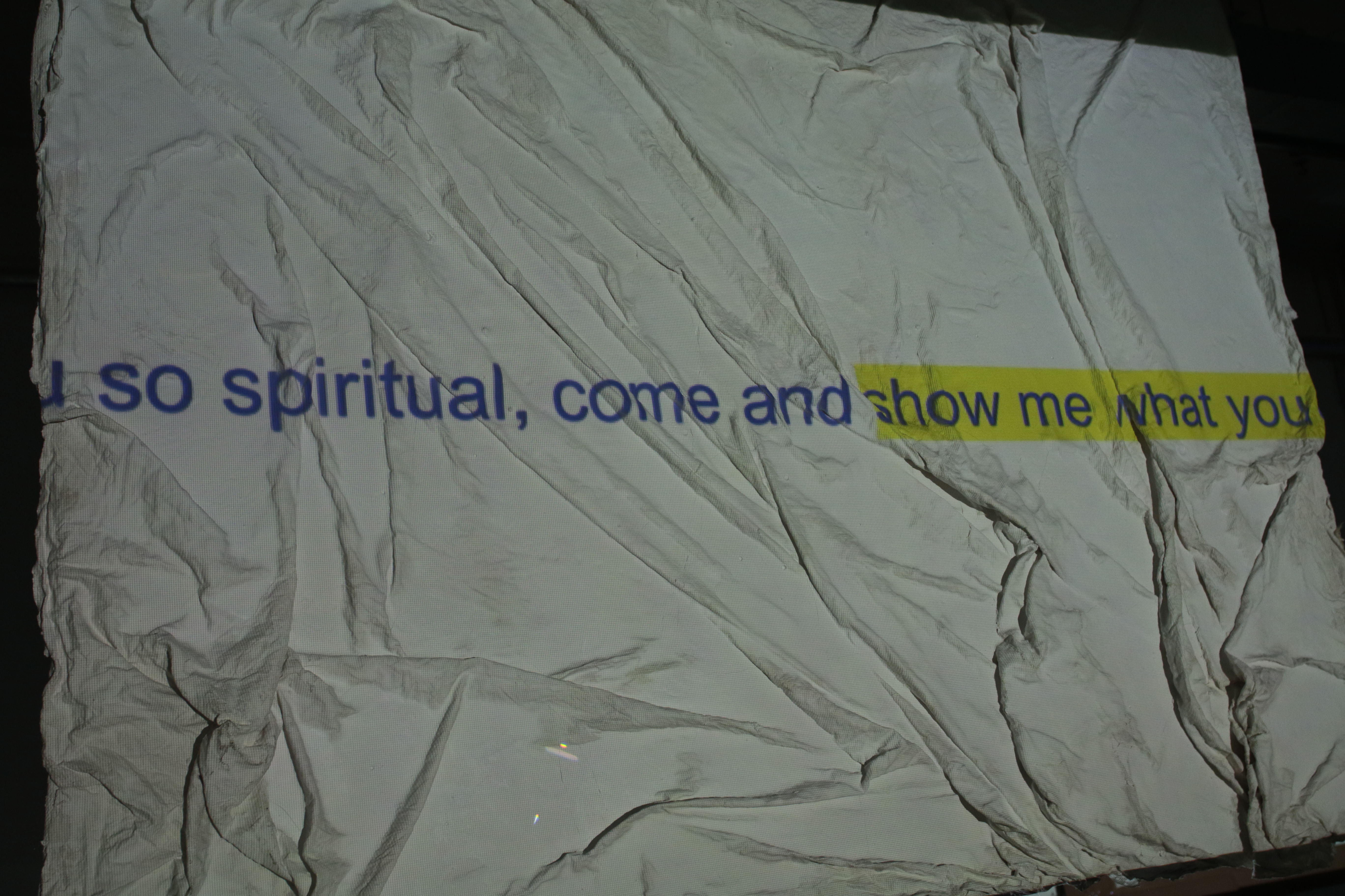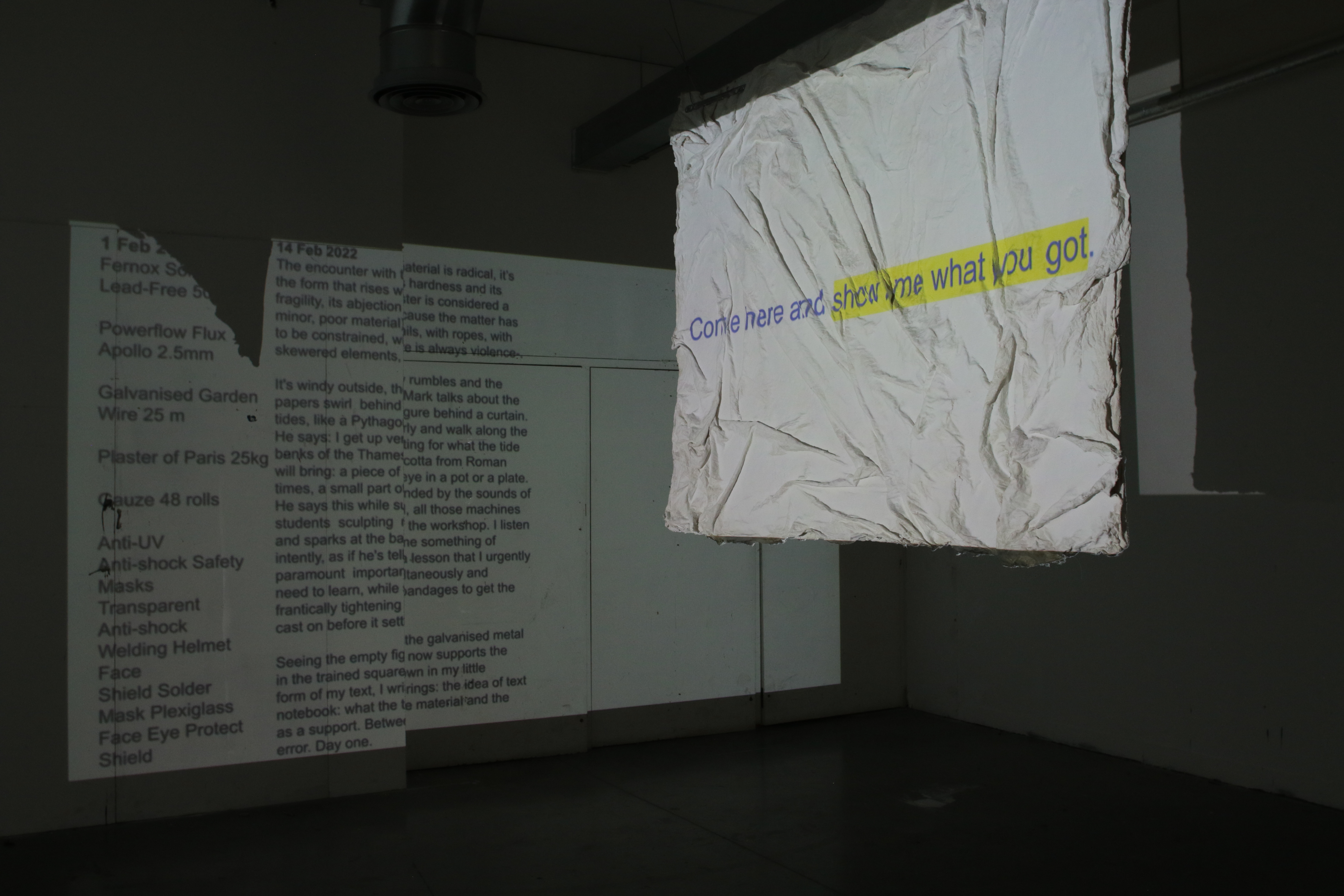 Video projections into different materials & silk screens printed onto cardboard, plaster and plastic bags.
